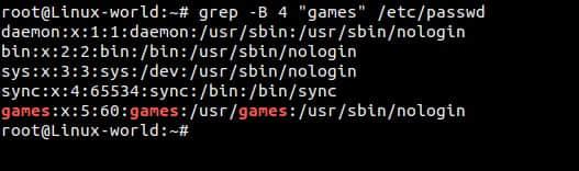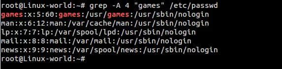 root@Linux-world:~# grep -A 4 "games" /etc/passwd