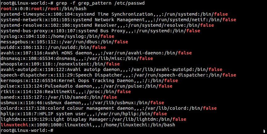 root@Linux-world:~# grep -f grep_pattern /etc/passwd