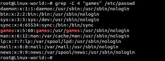 root@Linux-world:~# grep -C 4 "games" /etc/passwd