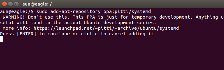 你将会看到警告信息因为我们尝试使用临时/测试PPA,而它们是不建议用于实际工作机器上的。
