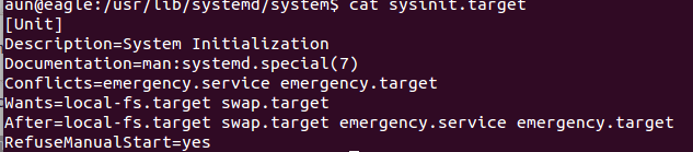 6. "sysinit.target"会启动重要的系统服务例如系统挂载,内存交换空间和设备,内核补充选项等等。sysinit.target在启动过程中会传递给local-fs.target。这个target单元的内容如下面截图里所展示。