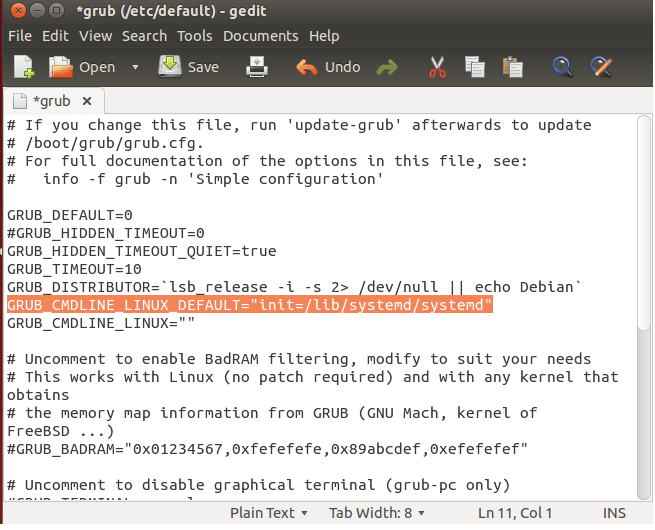 好吧,现在让我们编辑一下grub配置文件指定systemd作为默认引导程序。可以使用Gedit文字编辑器编辑grub配置文件。
