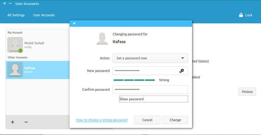 完成上述步骤,点击添加,你就创建好一个系统用户。这个用户还没有被激活,所以需要为其设置密码来激活。确保Users accounts界面已经解锁。点击尚不可用的账户,输入一个新密码,然后确认密码,点击Change。