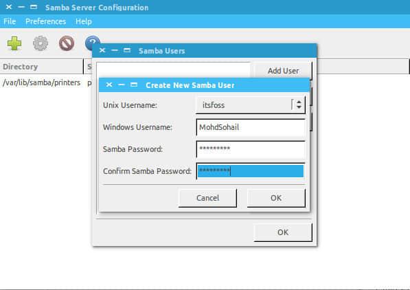 打开Samba,在Preference先点击Samba Users。填写弹出的对话框,下面是其中几个字段的说明: