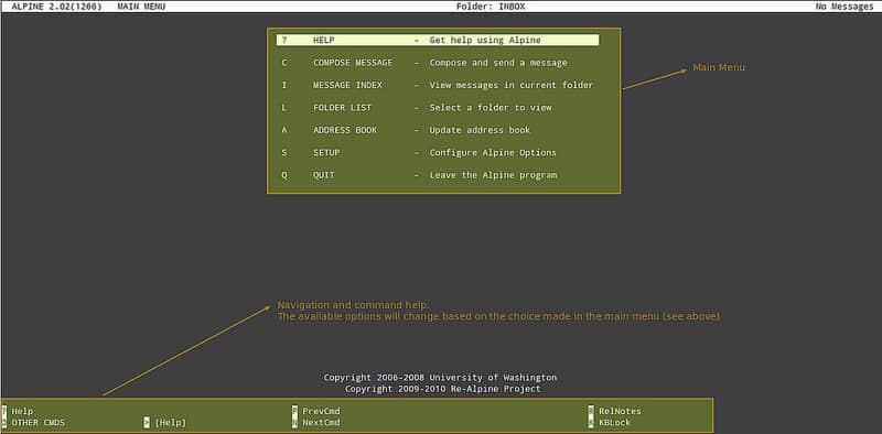 在你第一次启用 Alpine 时,它将在当前用户的家目录下创建一个邮件文件夹(~/mail),并显现出主界面,正如下面的视频所显示的那样:YOUTUBU 视频 - http://www.youtube.com/kuKiv3uze4U 。