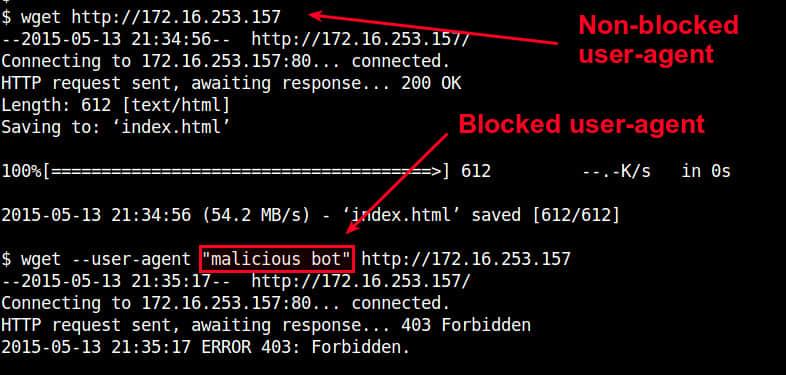 你可以通过使用带有 “--user-agent” 选项的 wget 测试用户代理阻挡。