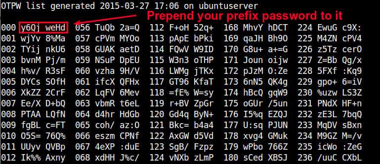 设置好密码前缀后,这个命令会产生 280 个一次性密码(LCTT 译注:保存到 ~/.otpw 下),并将它们导出到一个文本文件中(如 temporary_password.txt)。每个密码(默认是 8 个字符)由一个 3 位十进制数索引。你需要将这个密码表打印出来,并随身携带。