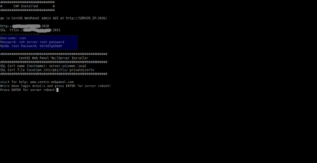 最后,你会看到如下安装完成的信息。记下一些详细信息,如mysql超级用户密码和CWP的登录URL,你随后会需要它们。然后,按下回车Enter重启系统。