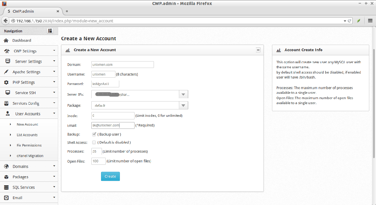 输入域名(ex.unixmen.com),用户名,密码和邮箱地址等等。最后,点击Create。