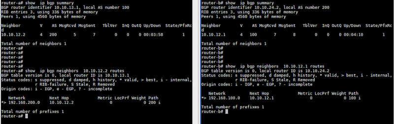 [root@router-b ~]# vtysh router-b# conf t router-b(config)# router bgp 200 router-b(config-router)# network 192.168.200.0/24 router-b(config-router)# neighbor 10.10.12.1 remote-as 100 router-b(config-router)# neighbor 10.10.12.1 password xmodulo