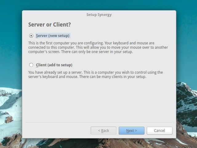 当你第一次打开 Synergy,它会引导你完成设置。你的主桌面就是你将与其它桌面共享输入设备的那个。将主桌面设为服务端,将其它桌面设置为客户端。