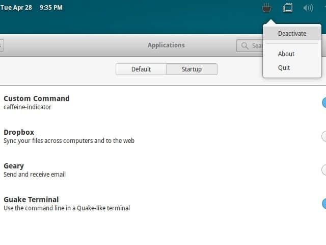 完成安装以后,将Caffeine指示器设置成开机自启动,这样可以使指示器显示在系统托盘里。你可以右键点击托盘图标打开应用的关联菜单,来开启或关闭Caffeine,