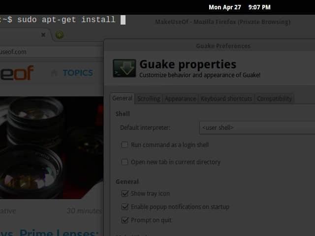 就像下面这张图,当打开时,Guake 的界面会覆盖在当前的屏幕上。你可以在终端中右键点击,调出 Preference 来改变 Guake 的界面,滚动方式,快捷键等等。