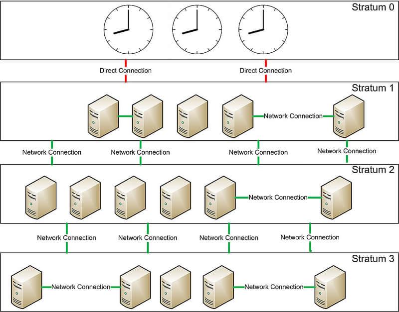 Stratum 0 由没有时间漂移的时钟组成,例如原子时钟。这种时钟不能在网络上直接使用。Stratum N (N > 1) 层服务器从 Stratum N-1 层服务器同步时间。Stratum N 时钟能通过网络和彼此互联。