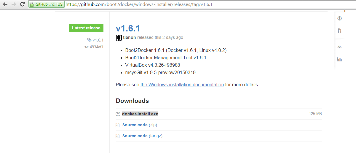 在我们开始安装之前,我们需要 Boot2Docker 的可执行文件。可以从 它的 Github 下载最新版本的 Boot2Docker。在这篇指南中,我们从网站中下载版本 v1.6.1。我们从那网页中用我们喜欢的浏览器或者下载管理器下载了名为 docker-install.exe 的文件。