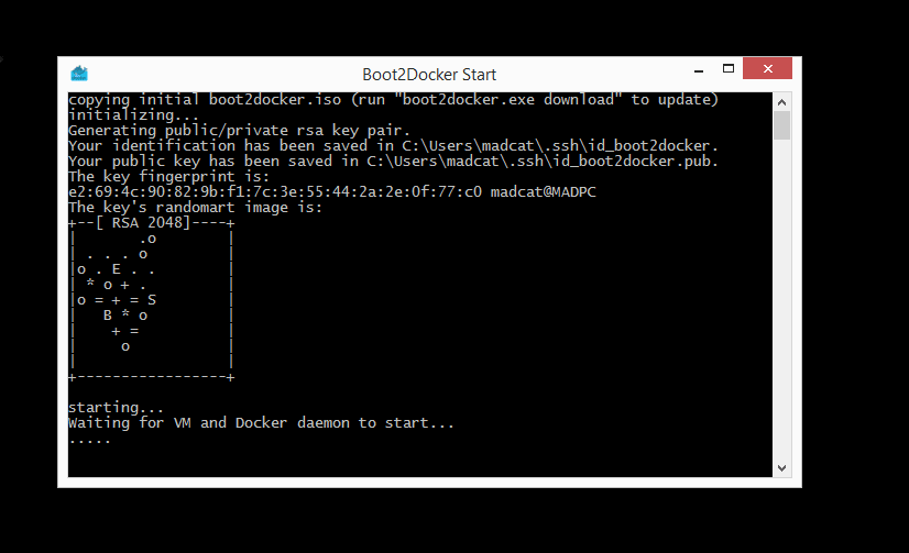 安装完成必要的组件之后,我们从桌面上的“Boot2Docker Start”快捷方式启动 Boot2Docker。它会要求你输入以后用于验证的 SSH 密钥。然后会启动一个配置好的用于管理在虚拟机中运行的 Docker 的 unix shell。