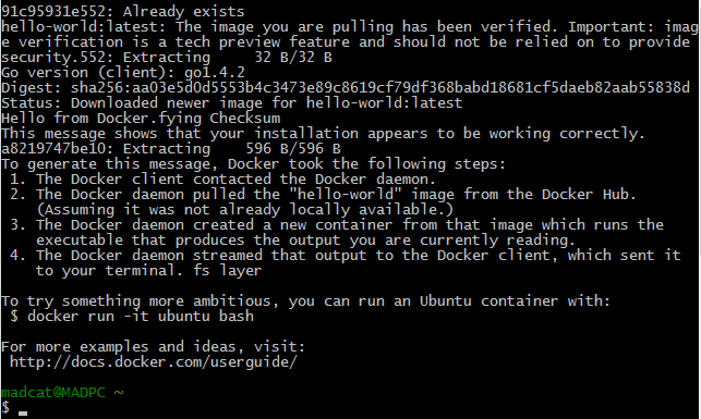 现在,让我们来试试 hello-world 例子镜像,它会下载 hello-world 镜像,运行并输出 "Hello from Docker" 信息。