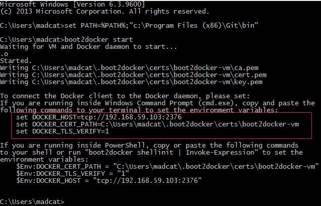 现在,如果你想开始用命令提示符使用 Docker,你可以打开命令提示符(CMD.exe)。由于 Boot2Docker 要求 ssh.exe 在 PATH 中,我们需要在命令提示符中输入以下命令使得 %PATH% 环境变量中包括 Git 安装目录下的 bin 文件夹。