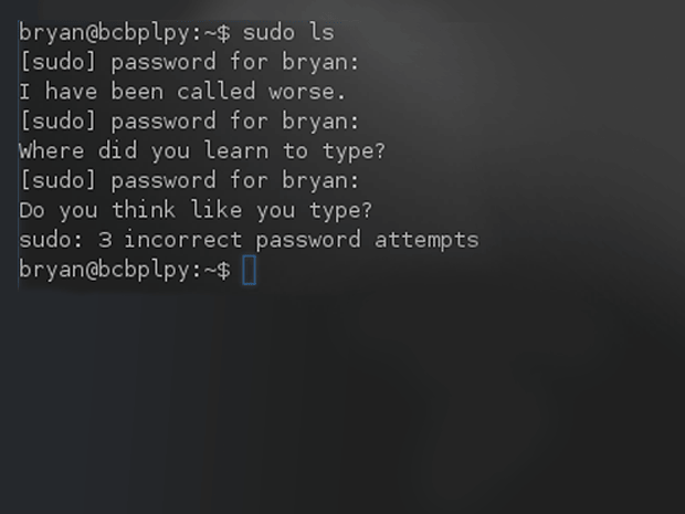 “我刚才对电脑做了什么?”你可能这样问自己。一定是美妙的事情吧。现在,在sudo命令提示提示下输出错误的口令,你的电脑就会指责你。我最喜欢的一句:“听好了,煎饼一样的脑子,我没有时间听你胡说八道了。”