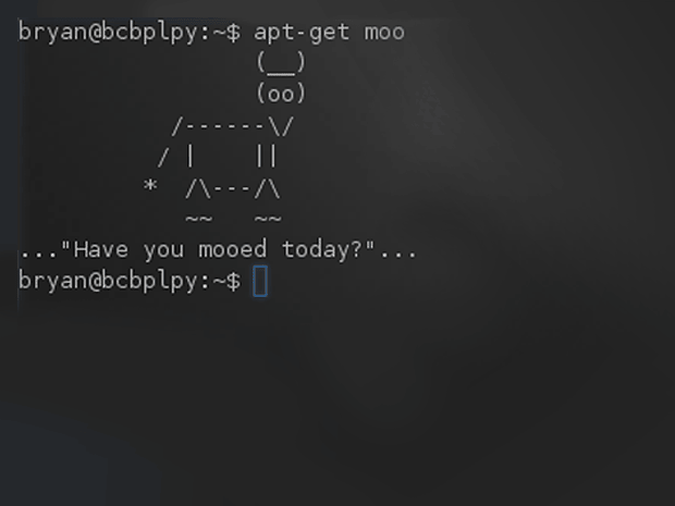 你看过这张截图?那就是运行apt-get moo(在基于Debian的系统)的结果。对,就是它了。不要对它抱太多幻想,你会失望的,我不骗你。但是这是Linux世界最被人熟知的彩蛋之一。所以我把它包含进来,并且放在前排,然后我也就不会收到5千封邮件,指责我把它遗漏了。