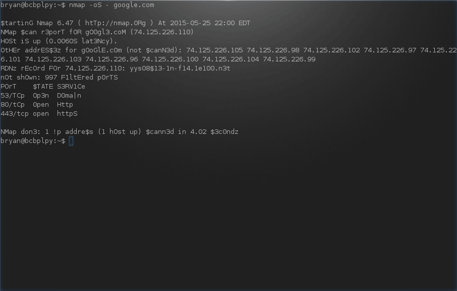nmap并不是我们平时经常使用的基本命令。但如果你想蹂躏nmap的话,比如像人一样看起来像l33t。在任何nmap命令后添加-oS(比如nmap -oS - google.com)。现在你的nmap已经处于标准叫法是“脚本玩具模式”的模式了。Angelina Jolie和Keanu Reeves会为此骄傲的。