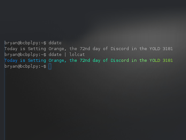 如果你们曾经坐在一起思考,“嗨!我想使用无用但异想天开的方式来书写今天的日期……”试试运行ddate。结果类似于“Today is Setting Orange, the 72nd day of Discord in the YOLD 3181”,这会让你的服务树日志平添不少趣味。