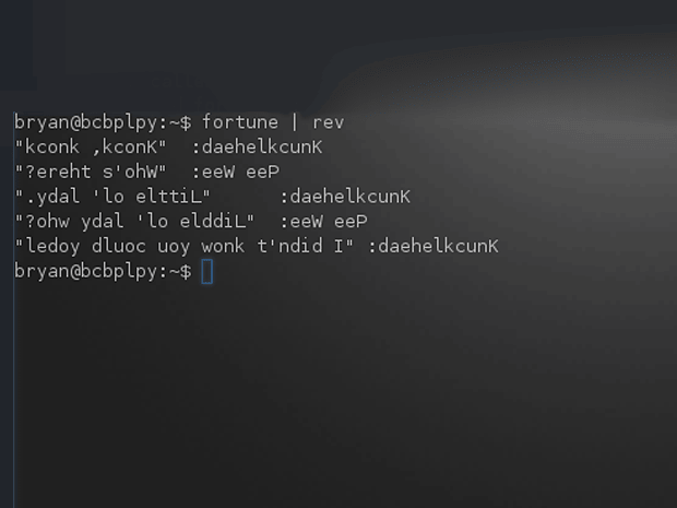 将任何文本使用管道输送给rev命令,它就会将文本内容逆序输出。fortune | rev会给你好运。当然,这不意味着rev会将幸运(fortune)转换成不幸。