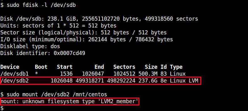 $ mount /dev/sdb2 /mnt mount: unknown filesystem type 'LVM2_member'