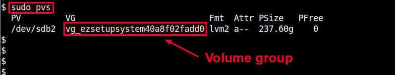 $ sudo pvs PV VG Fmt Attr PSize PFree /dev/sdb2 vg_ezsetupsystem40a8f02fadd0 lvm2 a-- 237.60g 0