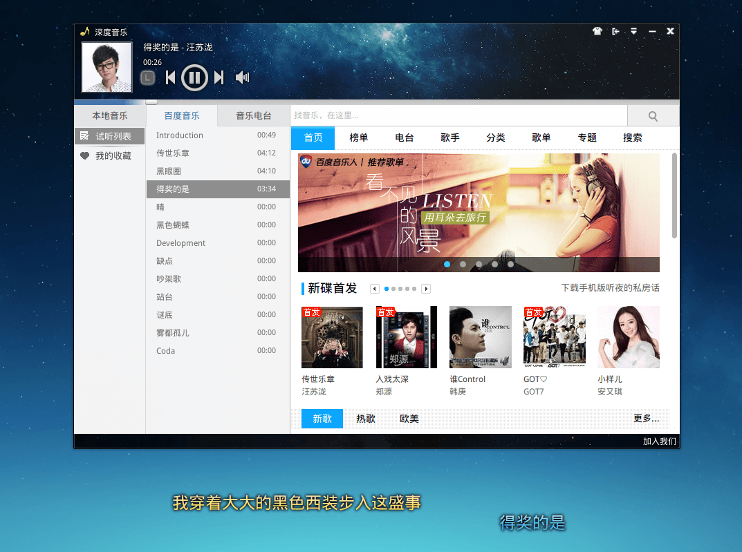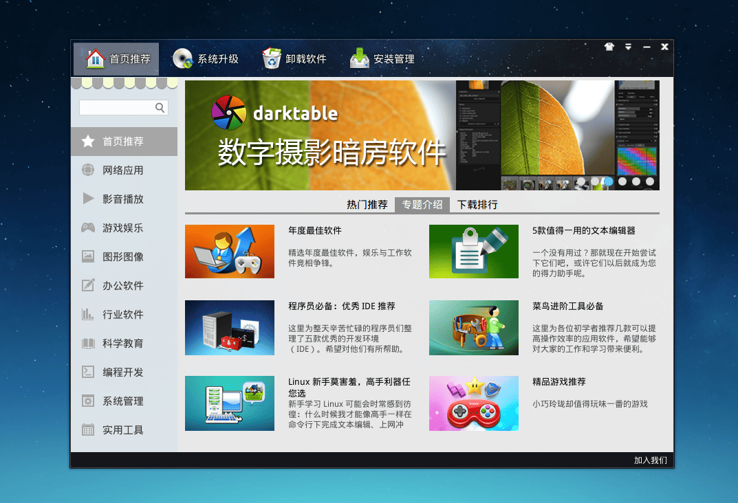 Deepin团队基于HTML5技术开发了的全新深度桌面环境,以及音乐播放器,视频播放器,软件中心等一系列特色软件。