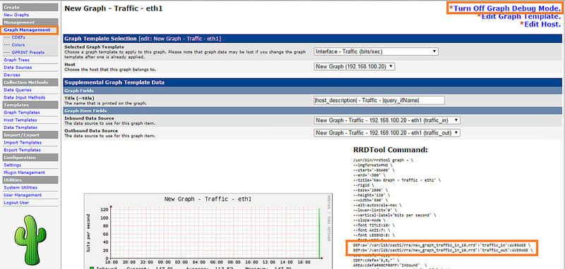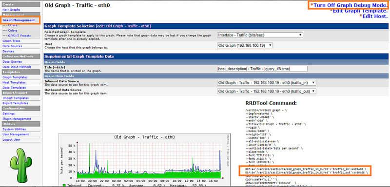 图合并的首个步骤是确定与图相关联的 RRD 文件。我们可以通过以调试模式打开图检查文件。要做到这点,在 Cacti 的菜单中: 控制台 > 管理图 > 选择图 > 打开图调试模式。