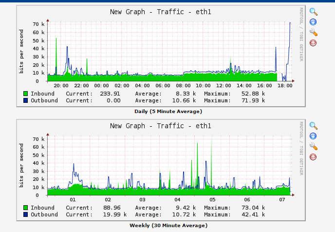 现在旧 RRD 文件中的数据已经追加到了新 RRD 文件中。Cacti 会将任何新数据写到新 RRD 文件中。如果我们点击图,我们可以发现也已经添加了旧图的周、月、年记录。下面图表中的第二幅图显示了旧图的周记录。