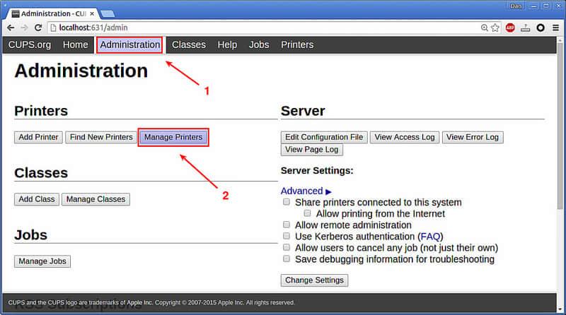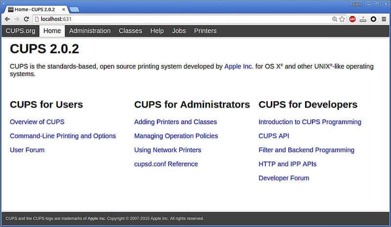 打开一个浏览器输入 http://localhost:631 。你会看到下面的打印机管理界面。