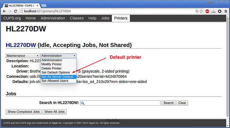 打印机应该可以工作了。你可以通过CUPS的网页看到打印机状态和管理打印机任务。