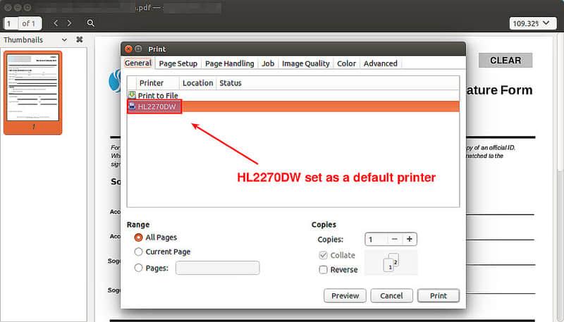 现在基础配置已经基本完成了。为了测试打印,打开任何文档浏览程序(比如:PDF浏览器)并打印。你会看到“HL-2270DW”被列出并被作为默认的打印机设置。