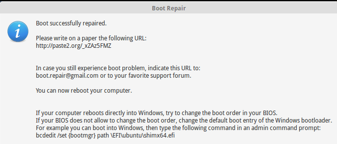 在这一过程结束后,它会提供一个由boot repair的日志组成的网页网址。如果你的引导问题这样都没有修复,你就可以去社区或是发邮件给开发团队并提交该网址作为参考。很酷!不是吗?