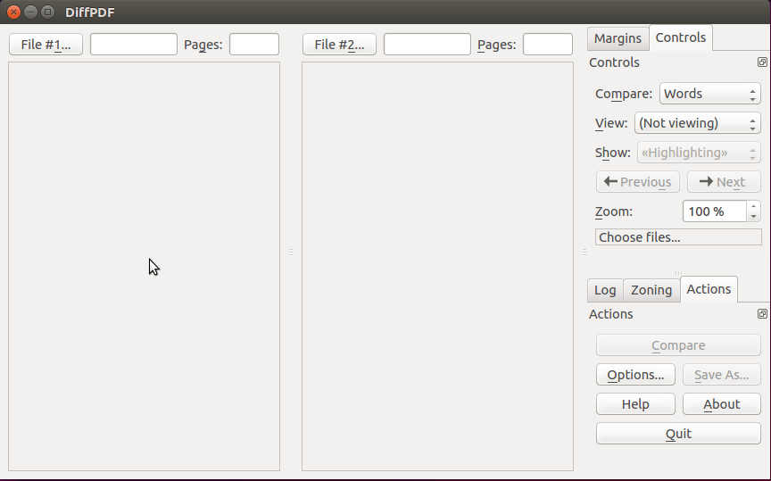 DiffPDF是一个图形化应用程序,用于对两个PDF文件进行对比。默认情况下,它只会对比两个相关页面的文字,但是也支持对图形化页面进行对比(例如,如果图表被修改过,或者段落被重新格式化过)。它也可以对特定的页面或者页面范围进行对比。例如,如果同一个PDF文件有两个版本,其中一个有页面1-12,而另一个则有页面1-13,因为这里添加了一个额外的页面4,它们可以通过指定两个页面范围来进行对比,第一个是1-12,而1-3,5-13则可以作为第二个页面范围。这将使得DiffPDF成对地对比这些页面(1,1),(2,2),(3,3),(4,5),(5,6),以此类推,直到(12,13)。