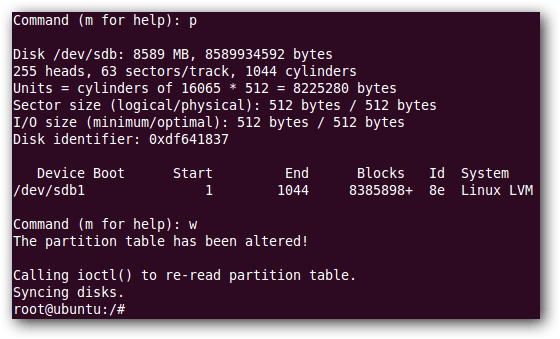 以指定的顺序输入命令创建一个使用新硬盘 100% 空间的主分区并为 LVM 做好了准备。如果你需要更改分区的大小或想要多个分区,我建议使用 GParted 或自己了解一下关于 fdisk 命令的使用。
