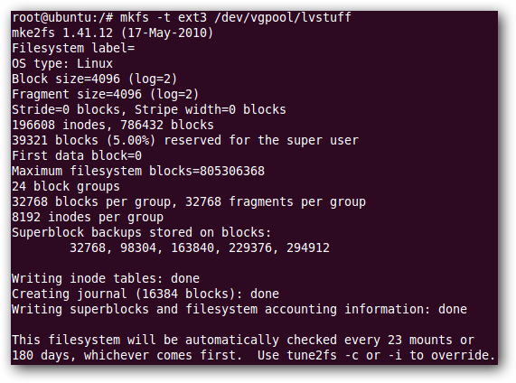 mkfs -t ext3 /dev/vgpool/lvstuff