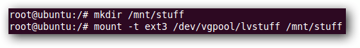 mkdir /mnt/stuff mount -t ext3 /dev/vgpool/lvstuff /mnt/stuff