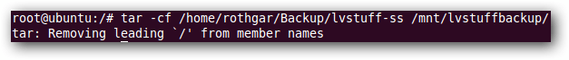 tar -cf /home/rothgar/Backup/lvstuff-ss /mnt/lvstuffbackup/