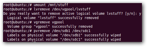 umount /mnt/lvstuff lvremove /dev/vgpool/lvstuff vgremove vgpool pvremove /dev/sdb1 /dev/sdc1