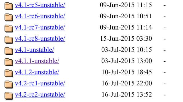 现在,访问这个内核 PPA 网页,并滚到底部。列表的最下面会含有最新发布的预选版本(你可以在名字中看到“rc”字样),但是这上面就可以看到最新的稳定版(说的更清楚些,本文写作时最新的稳定版是4.1.2。LCTT 译注:这里虽然 4.1.2 是当时的稳定版,但是由于尚未进入 Ubuntu 发行版中,所以文件夹名称为“-unstable”)。点击文件夹名称,你会看到几个选择。你需要下载 3 个文件并保存到它们自己的文件夹中(如果你喜欢的话可以放在下载文件夹中),以便它们与其它文件相隔离: