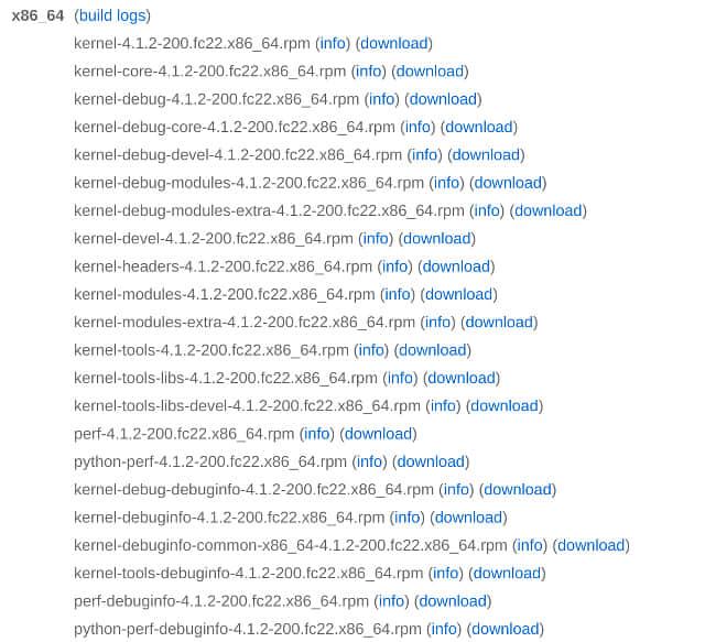 查看 最新 Fedora 内核构建列表。选取列表中最新的稳定版并翻页到下面选择 i686 或者 x86_64 版。这取决于你的系统架构。这时你需要下载下面这些文件并保存到它们对应的目录下(比如“Kernel”到下载目录下):