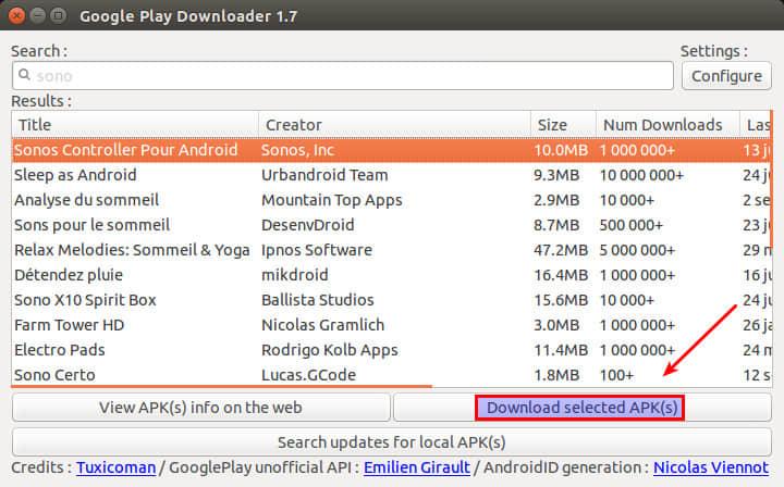 一旦你安装好 GooglePlayDownloader 后,你就可以像下面那样从 Google Play 商店下载 APK 文件。(LCTT 译注:显然你需要让你的 Linux 能爬梯子)