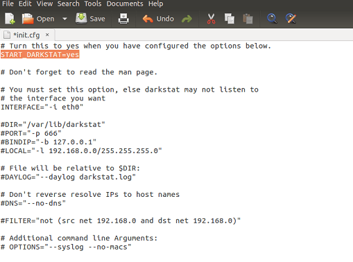 为了正确运行这个程序,我们需要执行一些基本的配置。运行下面的命令用gedit编辑器打开/etc/darkstat/init.cfg文件。