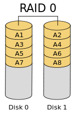 条带化有很好的性能。在 RAID 0(条带化)中数据将使用切片的方式被写入到磁盘。一半的内容放在一个磁盘上,另一半内容将被写入到另一个磁盘。
