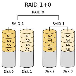 - RAID10 = 镜像 + 条带。(嵌套RAID)