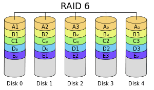 RAID 6 和 RAID 5 相似但它有两个分布式奇偶校验。大多用在大数量的阵列中。我们最少需要4个驱动器,即使有2个驱动器发生故障,我们依然可以更换新的驱动器后重建数据。