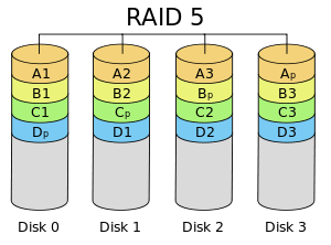 假设我们有4个驱动器,如果一个驱动器发生故障而后我们更换发生故障的驱动器后,我们可以从奇偶校验中重建数据到更换的驱动器上。奇偶校验信息存储在所有的4个驱动器上,如果我们有4个 1TB 的驱动器。奇偶校验信息将被存储在每个驱动器的256G中,而其它768GB是用户自己使用的。单个驱动器故障后,RAID 5 依旧正常工作,如果驱动器损坏个数超过1个会导致数据的丢失。